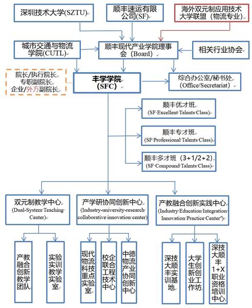 深圳技术大学丰学学院依托城市交通与物流学院进行建设和运行管理,可设名誉院长1人;设院长1人(由城市交通与物流学院院领导兼任),执行院长1人,专职副院长(学校方)1名、兼职副院长(顺丰方)1名,师资由校内教师(来自物流管理、交通运输等专业)和企业教师(来自顺丰在内的物流及供应链领域内的相关企业)构成。下设综合办公室/秘书处,负责统筹校企合作和人才培养的相关事宜,其他党群、行政、教学、科研、研究生等管理工作由城市交通与物流学院统一管理。