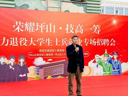 随后,马正伟副院长代表学院致辞。他表示,学院始终高度重视退役军人大学生的培养与就业工作,此次联合坪山区退役军人事务局举办专场招聘会,正是精准对接退役军人就业需求与企业用人需求的重要举措,旨在为学子搭建优质就业平台,助力退役军人大学生平稳转型、顺利就业。同时,他叮嘱学子们珍惜此次招聘机会,积极与企业沟通对接,找准职业定位,顺利开启职业生涯新篇章。